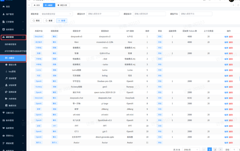 为了门户网站正常使用AI模型,需要在后台管理系统启用AI模型。菜单路径如下:模型管理 -> AI模型。