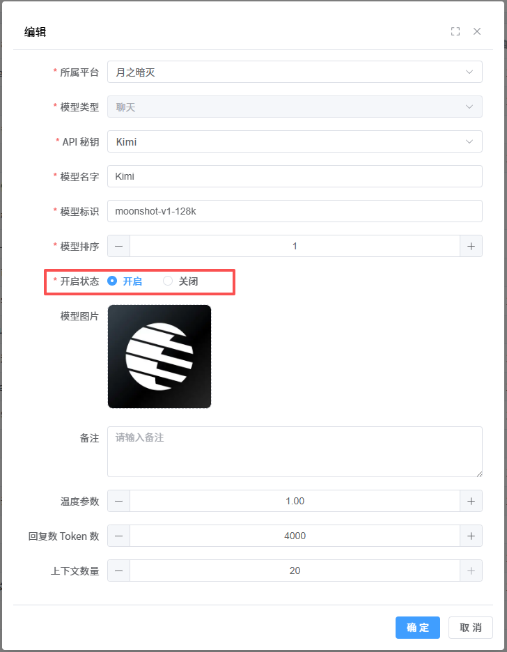 点击对应模型的编辑按钮,弹出编辑窗口,将开启状态设置成:开启。