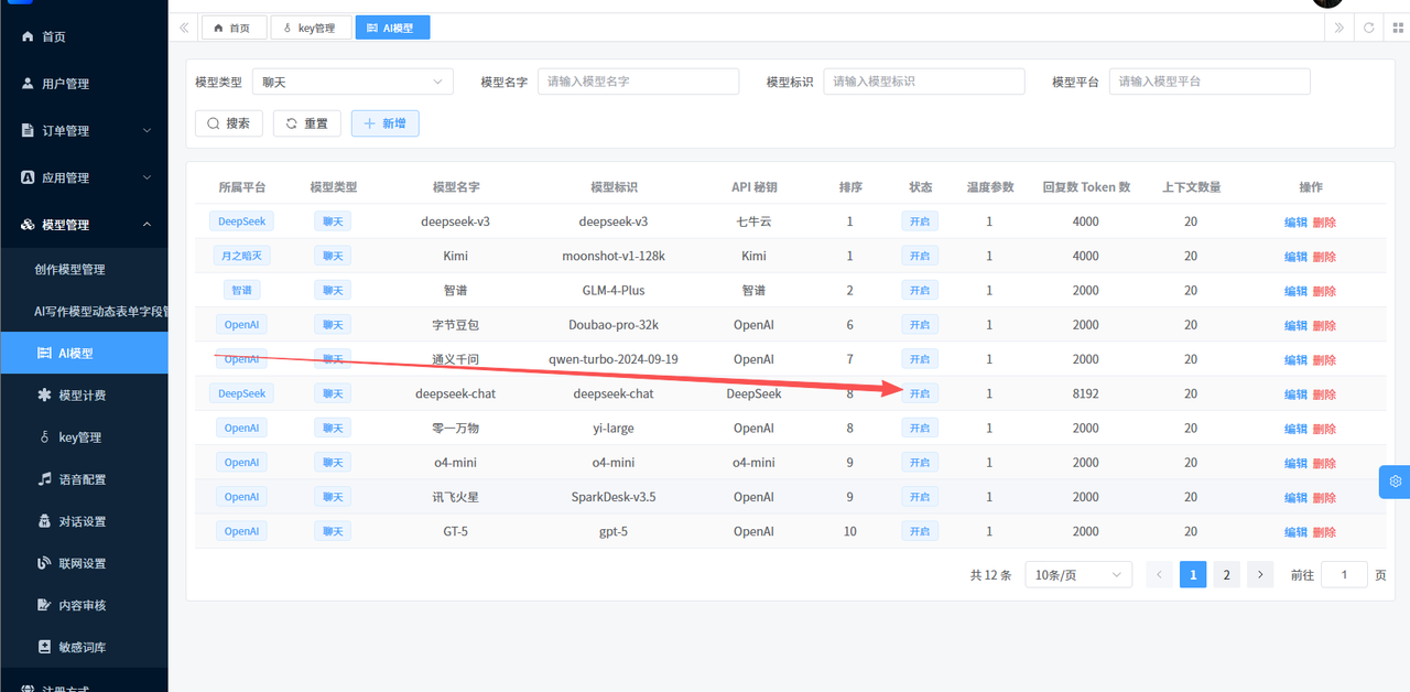绘画的联想功能依赖deepseek-chat模型配置。所以需要在后台管理系统中启用deepseek-chat模型。菜单路径如下:模型管理 -> AI模型。