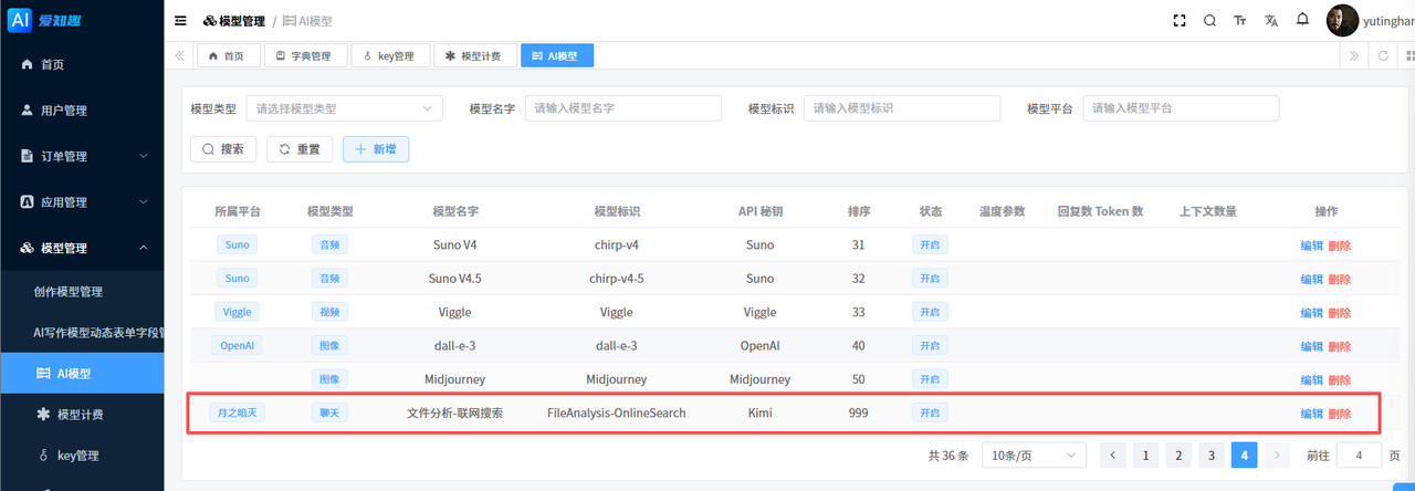 菜单路径:模型管理 -> AI模型。注意本系统的文件分析功能依赖Moonshot平台的Kimi模型,所以请确保已经配置好Kimi的模型Key(如未配置,请参考章节3.5进行配置)