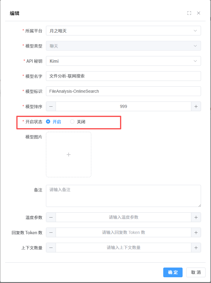 智能对话的文件分析功能需要将“文件分析-联网搜索”模型开启。如未开启,请点击编辑按钮,弹出编辑弹窗,将开启状态设置成开启。
